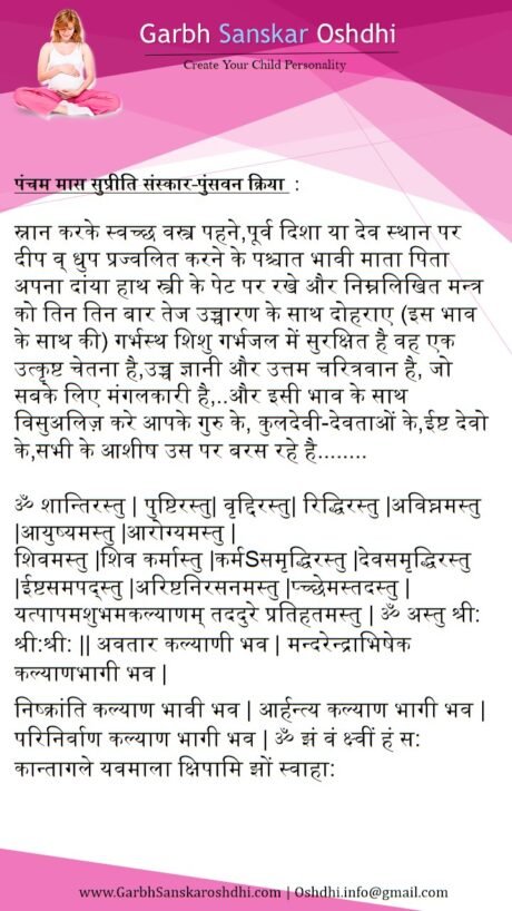 प्रीति संस्कार : स्नान करके स्वच्छ वस्त्र पहने,पूर्व दिशा या देव स्थान पर दीप व् धुप प्रज्वलित करने के पश्चात भावी माता पिता अपना दांया हाथ स्त्री के पेट पर रखे और इस भाव के साथ निम्नलिखित मन्त्र को तिन तिन बार दोहराए की गर्भस्थ शिशु एक उत्कृष्ट चेतना है,उच्च ज्ञानी और उत्तम चरित्रवान है, जो सबके लिए मंगलकारी है,..और इसी भाव के साथ विसुअलिज़ करे आपके गुरु के, कुलदेवी-देवताओं के,ईष्ट देवो के,सभी के आशीष उस पर बरस रहे है……..